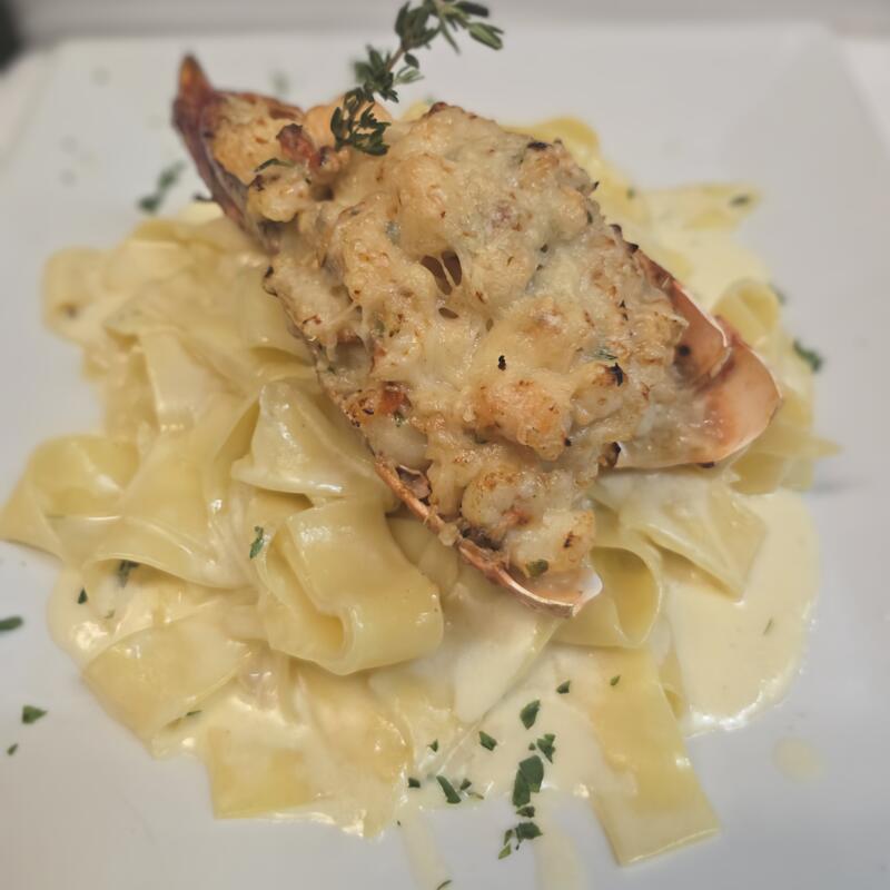 Topped with crab meat in a parmesan cream sauce served over pappardelle pasta